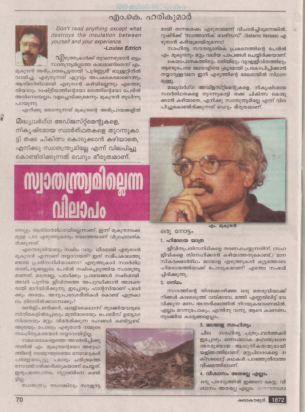 = എം.കെ.ഹരികുമാർ: ജീവിതം നമുക്ക് കൂടെക്കൊണ്ടുപോകാനുള്ളതല്ല. അത് എപ്പോഴും നമുക്ക് ബോധ്യപ്പെടണമെന്നില്ല. കാലം നമ്മെ തോൽപിക്കുമെന്നറിഞ്ഞാലും നമ്മൾ വൃഥാ ശ്രമിച്ചുകൊണ്ടിരിക്കും. വലിയ യാഥാർത്ഥ്യങ്ങൾ ചിലപ്പോൾ, ഇടവേളകളുടെ നേരിയ അംശങ്ങളിൽ നമ്മളിലേക്ക് പ്രകാശമായി കടന്നുവരാം. എന്നാൽ അതവിടെ നിൽക്കില്ലല്ലോ. മനസ്സിന്റെ ചുമതലയോ സ്വഭാവമോ അല്ല, ഇങ്ങനെ വരുന്ന സിഗ്നലുകളെ പിടിച്ചെടുത്ത് വ്യാഖ്യാനിക്കുക എന്നത്. അത് സംഭവിക്കുന്നു എന്ന് മാത്രം.